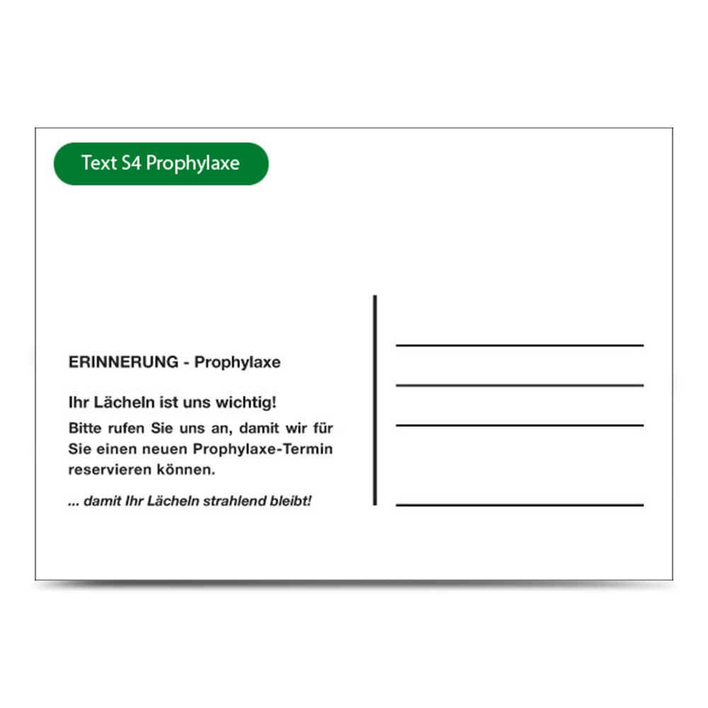 Eindruck der Praxisadresse, Logo- und Farbeindruck und individuelle Rückseitentexte gegen Aufpreis möglich.