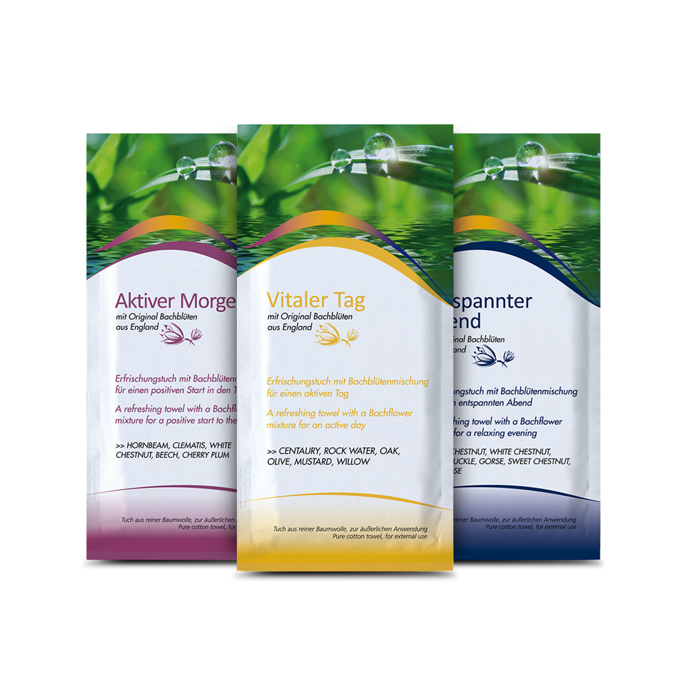 Mit der Kraft der Original-Bachblüten aus England Bachblütentücher aus Baumwolle von Coolike Weiche Baumwolltücher mit ausgewählten Bachblütenessenzen. Bachblüten gehören zu den wirksamsten Heilpflanzen der Naturmedizin. Sie spenden Kraft und Energie, entspannen und haben einen harmonisierenden Einfluss auf die innere Balance. Die Bachblütentücher enthalten traditionelle Kombinationen abgestimmter Blütenessenzen zur äußerlichen Anwendung. Einfach auf Stirn, Nacken oder Unterarme legen, Duft genießen und der wohltuenden Wirkung nachspüren. Durch leichtes Abreiben der Haut intensiviert sich die Kraft der Tücher.