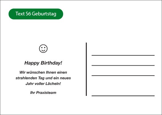 | Beschreibung | Optisch ansprechende Recallkarten aus qualitativ hochwertigem, stabilem Karton. Auf der Motivseite mit einem seidenmatten Lack veredelt. Größe: 15,2 x 10,8 cm. Standardeindruck bei allen Produkten in schwarz. Alle Rückseitentexte auch als "Du"-Version erhältlich. Optional: Eindruck der Praxisadresse, Logo- und Farbeindruck und individuelle Rückseitentexte gegen Aufpreis möglich. Fragen Sie danach kostenlos unter 0800 - 68 00 00 0 (aus DE) und 00800 - 68 00 00 00 (aus AT, CH) oder kontaktieren Sie uns per E-Mail unter kontakt@jfm.de. |